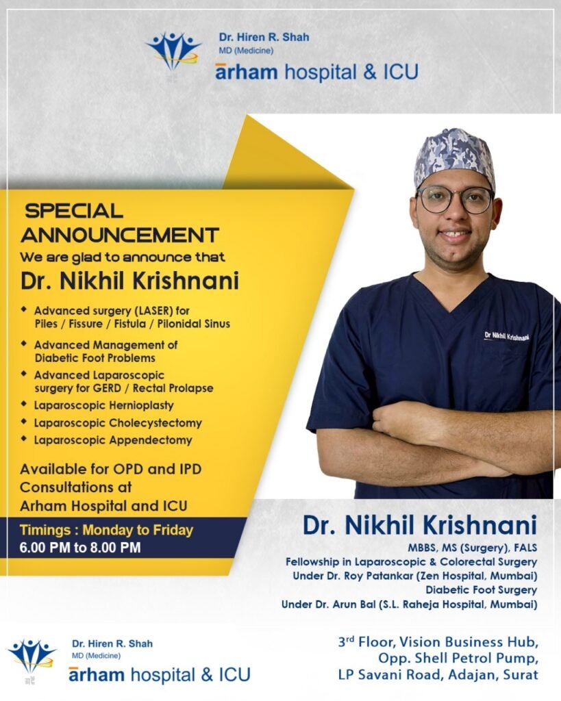 In an exciting development, Arham Hospital is proud to announce its association with Dr. Daxesh Desai, a renowned general surgeon in the area. This collaboration enables the hospital to offer comprehensive surgical care, further expanding its ability to serve the community.